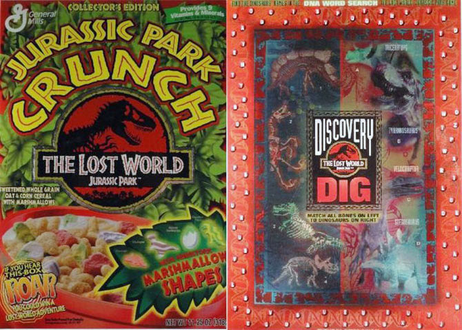 That's right, The Lost World had its own cereal, called Jurassic Park Crunch, from General Mills, and I desperately think they should bring it back, whether or not they ever decide to release Jurassic Park 4 from the top secret military vaults (or wherever they're hiding it). It was one of those things that I only barely remembered until I searched for it. The stuff actually did exist and indeed wasn't just some fantastic dream I had once or something. I remember there being marshmallow dinosaur eggs that dissolved in the milk and "hatched" dinosaur shapes or something like that. Unfortunately I didn't know it was a limited-time thing at the time, or else I probably would've bought the store out of it!